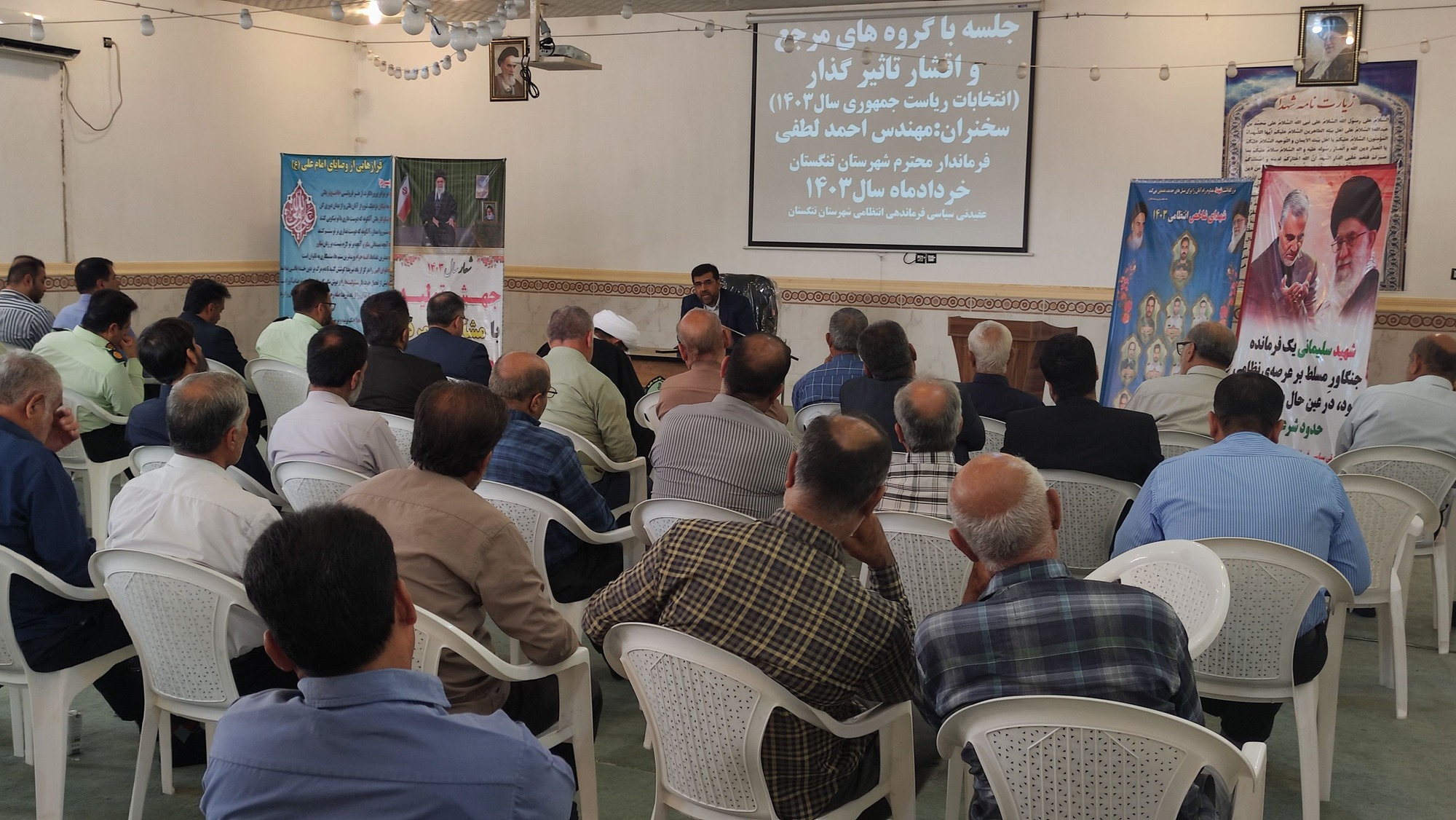 نشست فراندار تنگستان با گروه های مرجع و فعالان انتخابات ریاست جمهوری در شهرستان که امام جمعه اهرم ، معاون سیاسی امنتی و اجتماعی فرمانداری شهرستان و جمعی ازمدیران و فعالان اجتماعی و انتخابات ریاست جمهوری در تنگستان حضر داشتند سالن اجتماعات نیروی انتظامی شهرستان برگزارشد