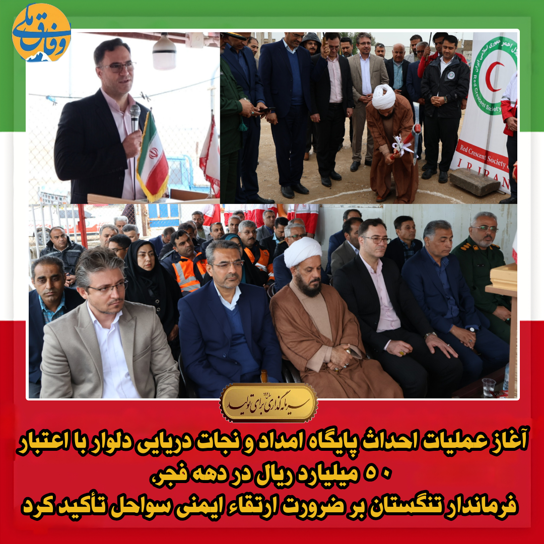 آغاز عملیات احداث پایگاه امداد و نجات دریایی دلوار با اعتبار ۵۰ میلیارد ریال در دهه فجر، فرماندار تنگستان بر ضرورت ارتقاء ایمنی سواحل تأکید کرد
