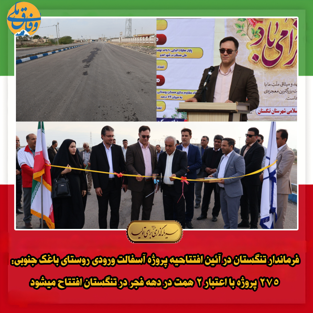 فرماندار تنگستان در آئین افتتاحیه پروژه آسفالت ورودی روستای باغک جنوبی: ۲۷۵ پروژه با اعتبار ۲ همت در دهه فجر در تنگستان افتتاح میشود  فرماندار تنگستان در آئین افتتاحیه پروژه آسفالت ورودی روستای باغک جنوبی: ۲۷۵ پروژه با اعتبار ۲ همت در دهه فجر در تنگستان افتتاح میشود